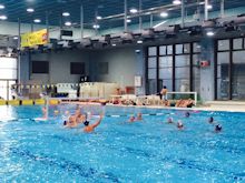 写真に見える範囲で4か所で指導が展開されており、まさに水球の聖地。
