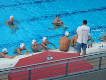 マルギット島の同プールでは、ジュニアの水球指導が所せましと展開されている。